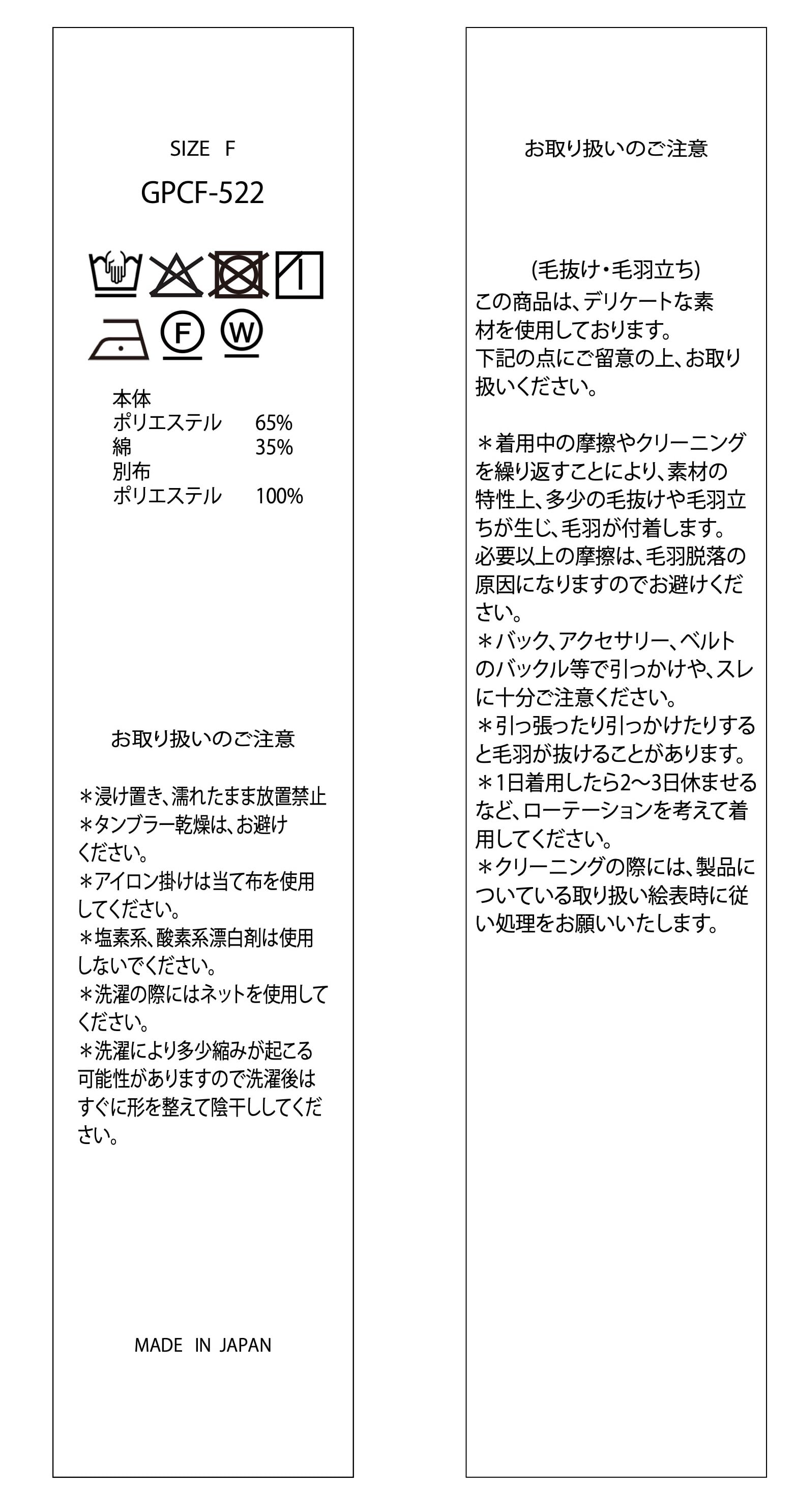 ※6. 着用中の摩擦やクリーニングを繰り返すことにより、素材の特性上、多少の毛抜けや毛羽立ちが生じ、毛羽が付着します。必要以上の摩擦は、毛羽脱落の原因になりますのでお避けください。