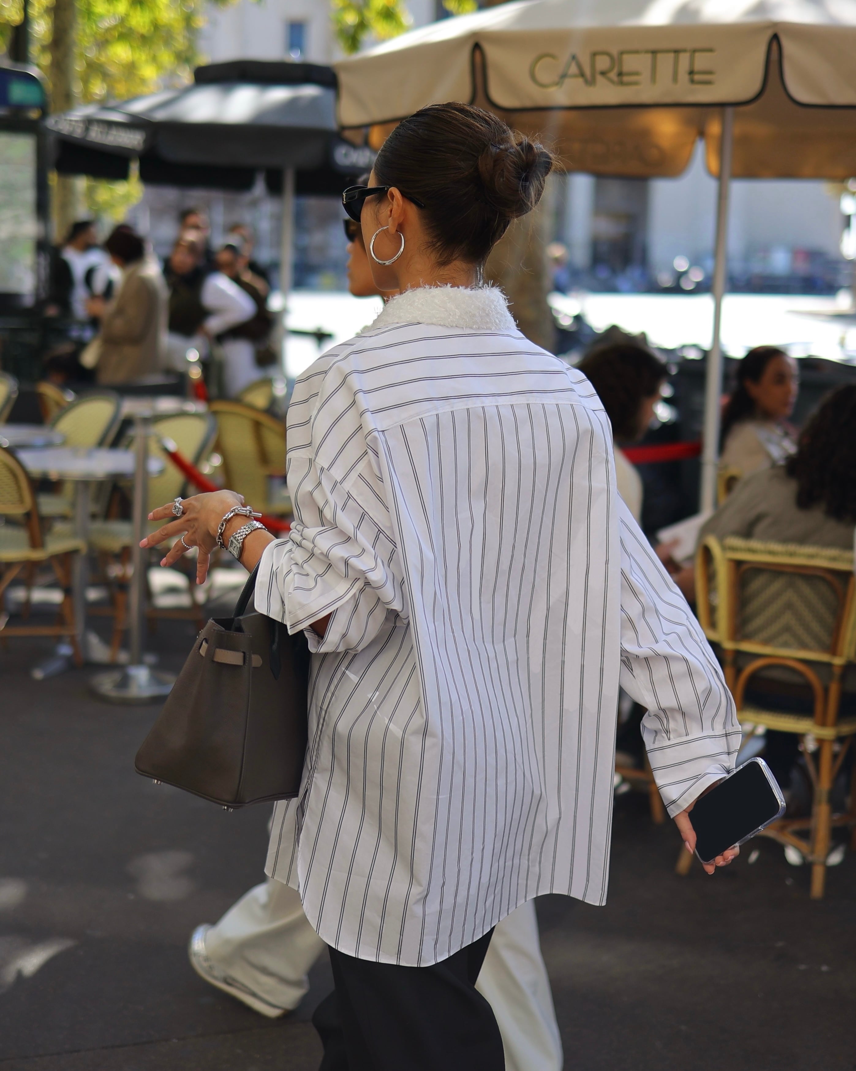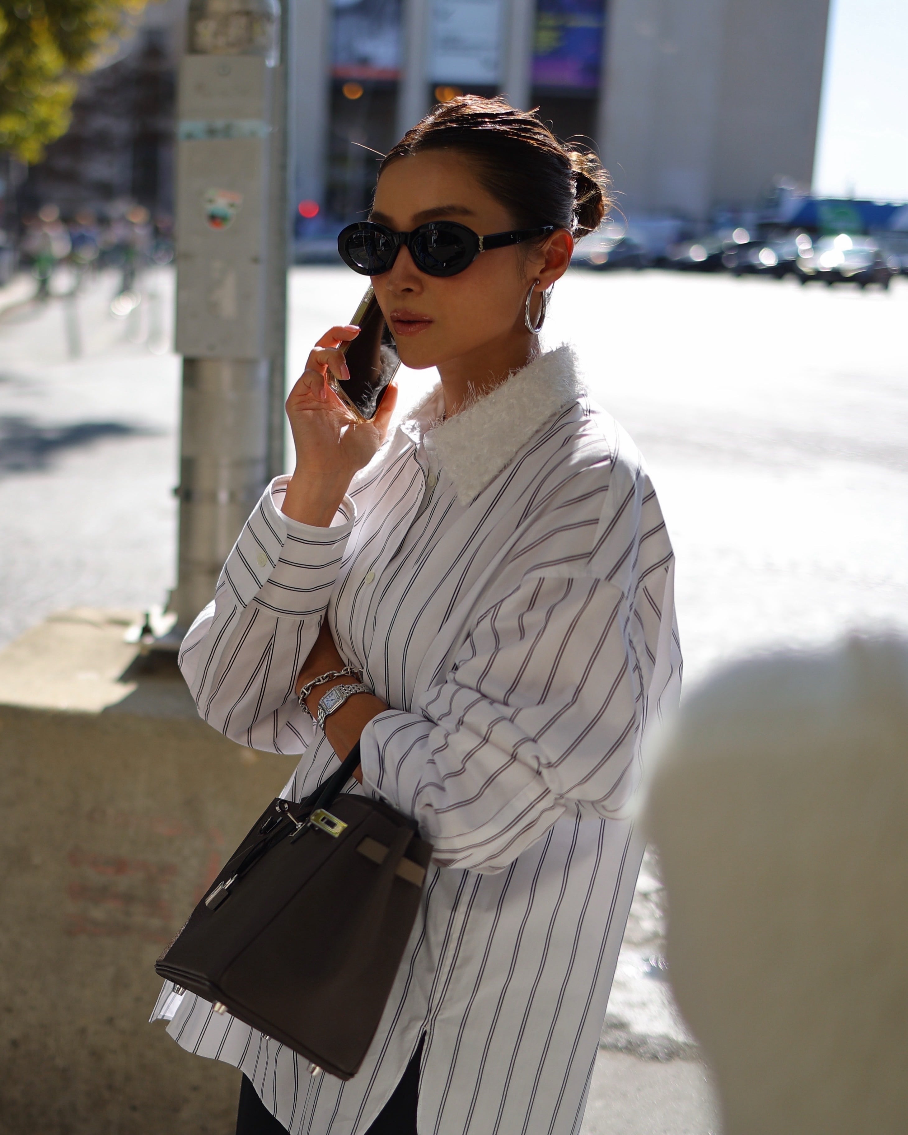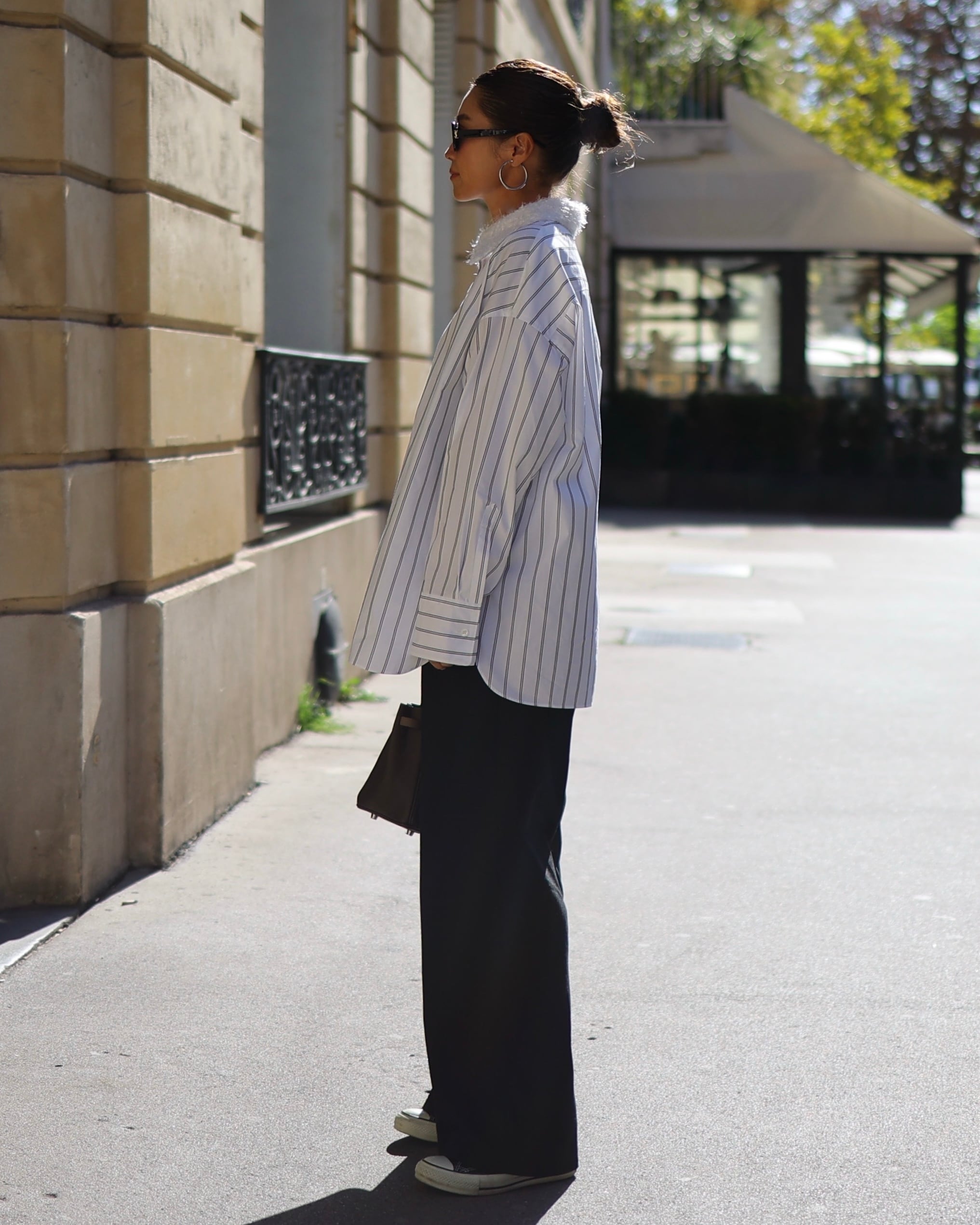 程よくゆったりとしたオーバーサイズに、サイドスリットや丸みのある裾が抜け感をプラスし、普段のコーディネートを軽やかに仕上げてくれます。ストライプ柄がアクセントになり、シンプルな着こなしに取り入れるだけで華やかな印象に。
