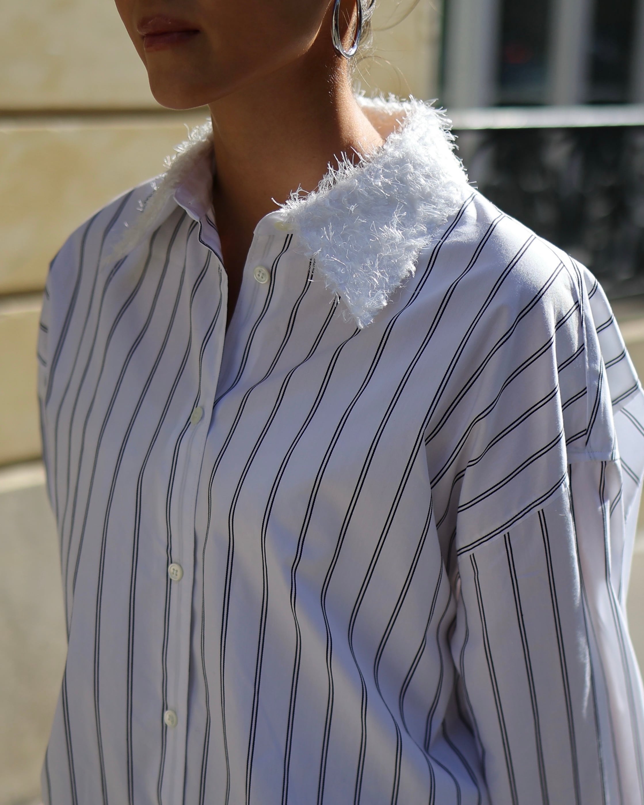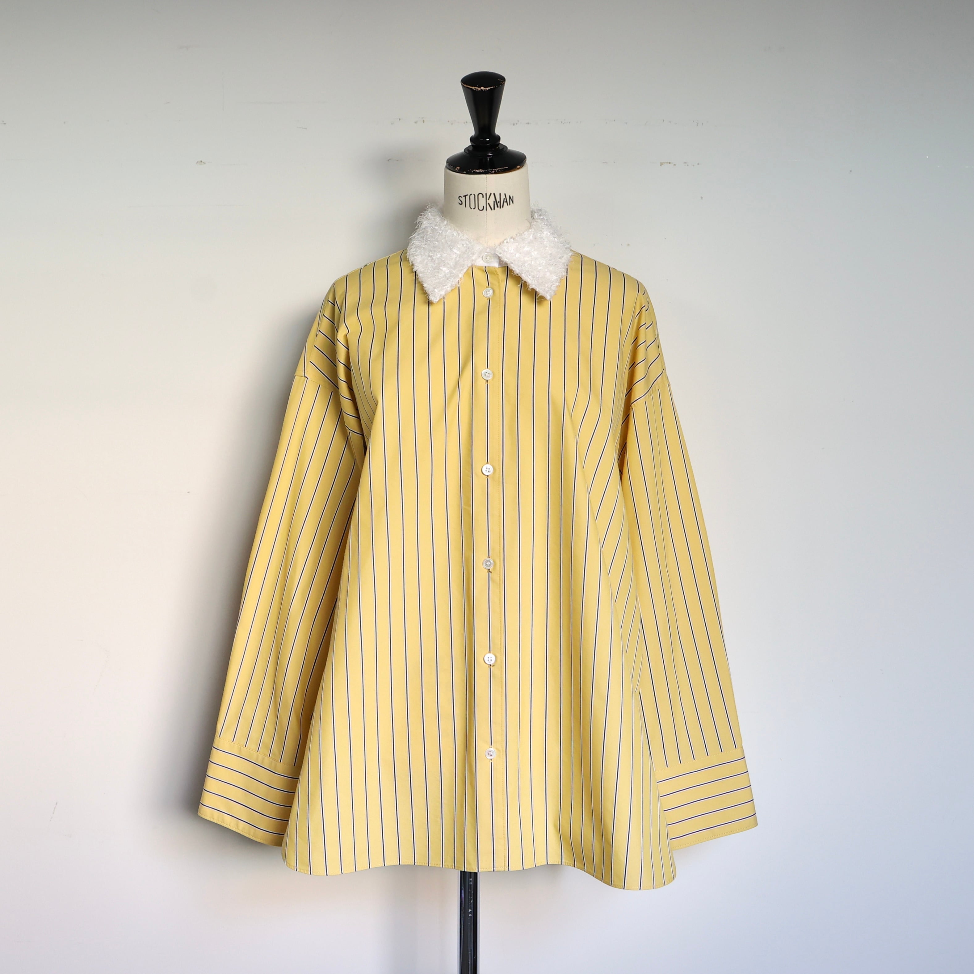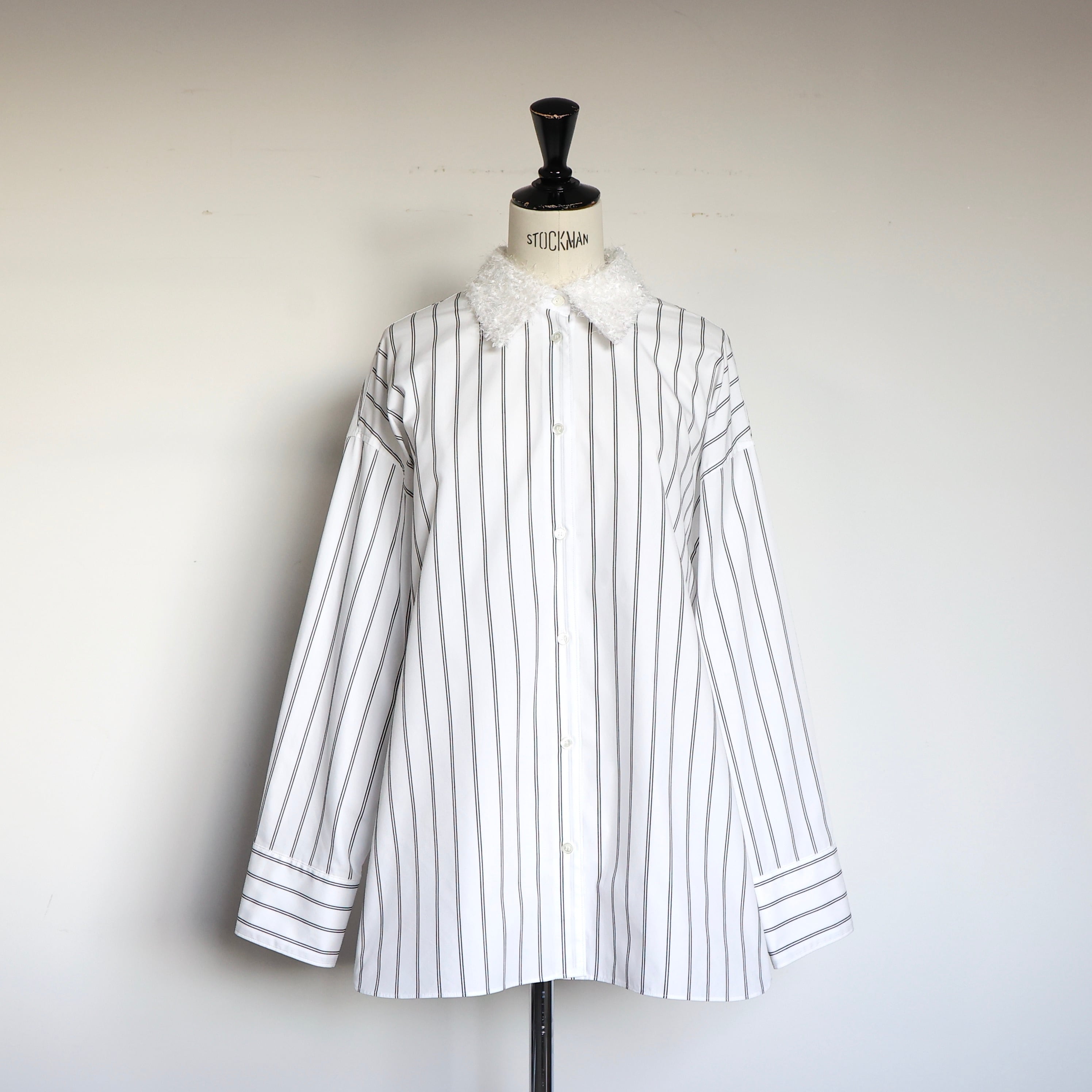 柔らかな羽のようなフェザー襟が顔まわりを華やかに見せる“スノーブラウスストライプ”