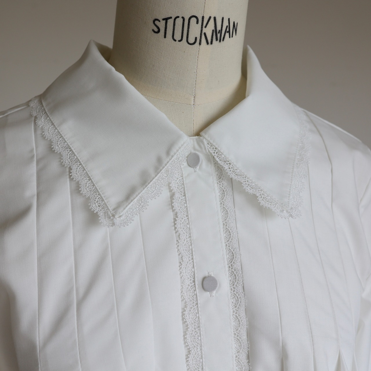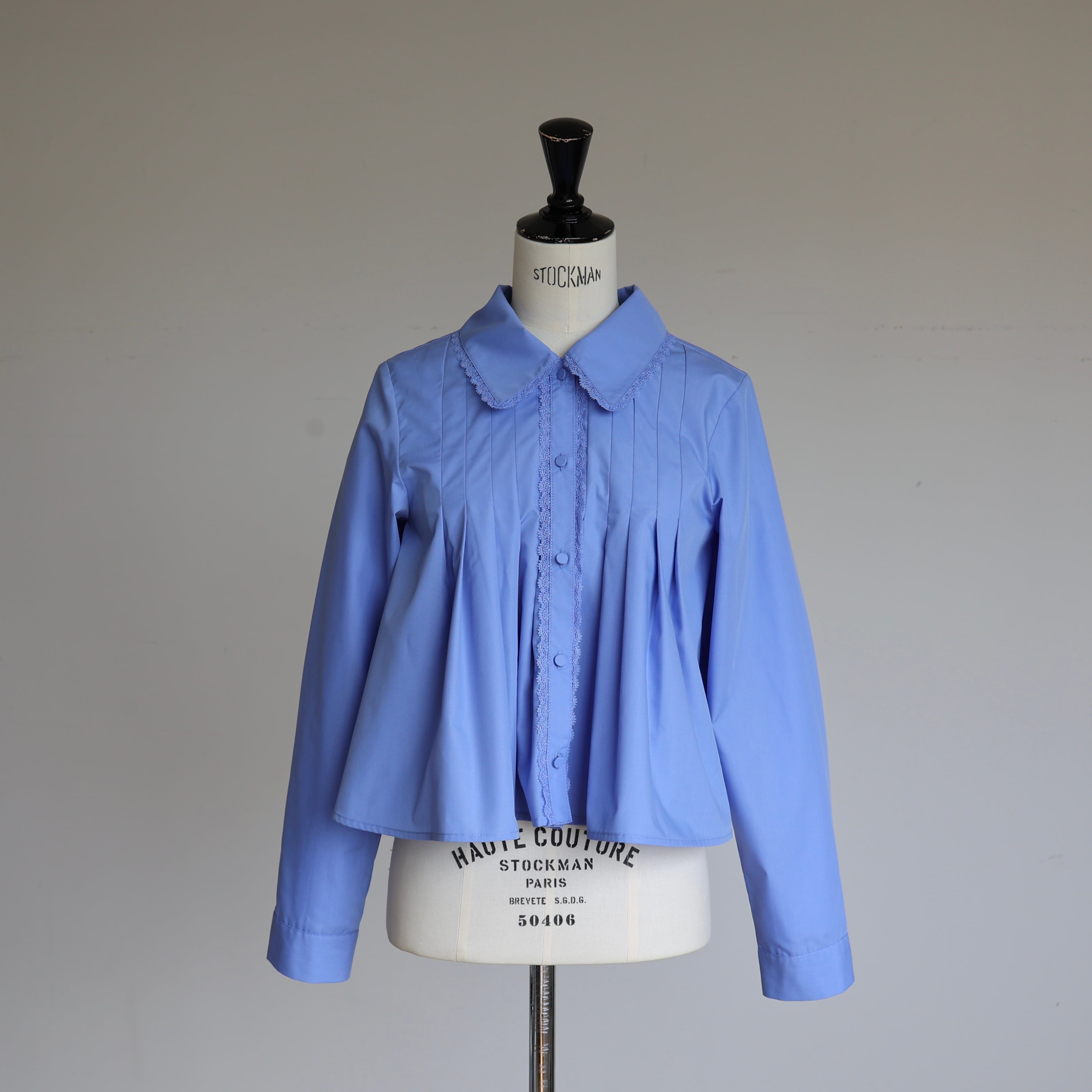 レースの衿が上品に、フロントの繊細なタックと、ふんわり広がる裾のシルエットが、動くたびに女性らしい柔らかさを演出します。