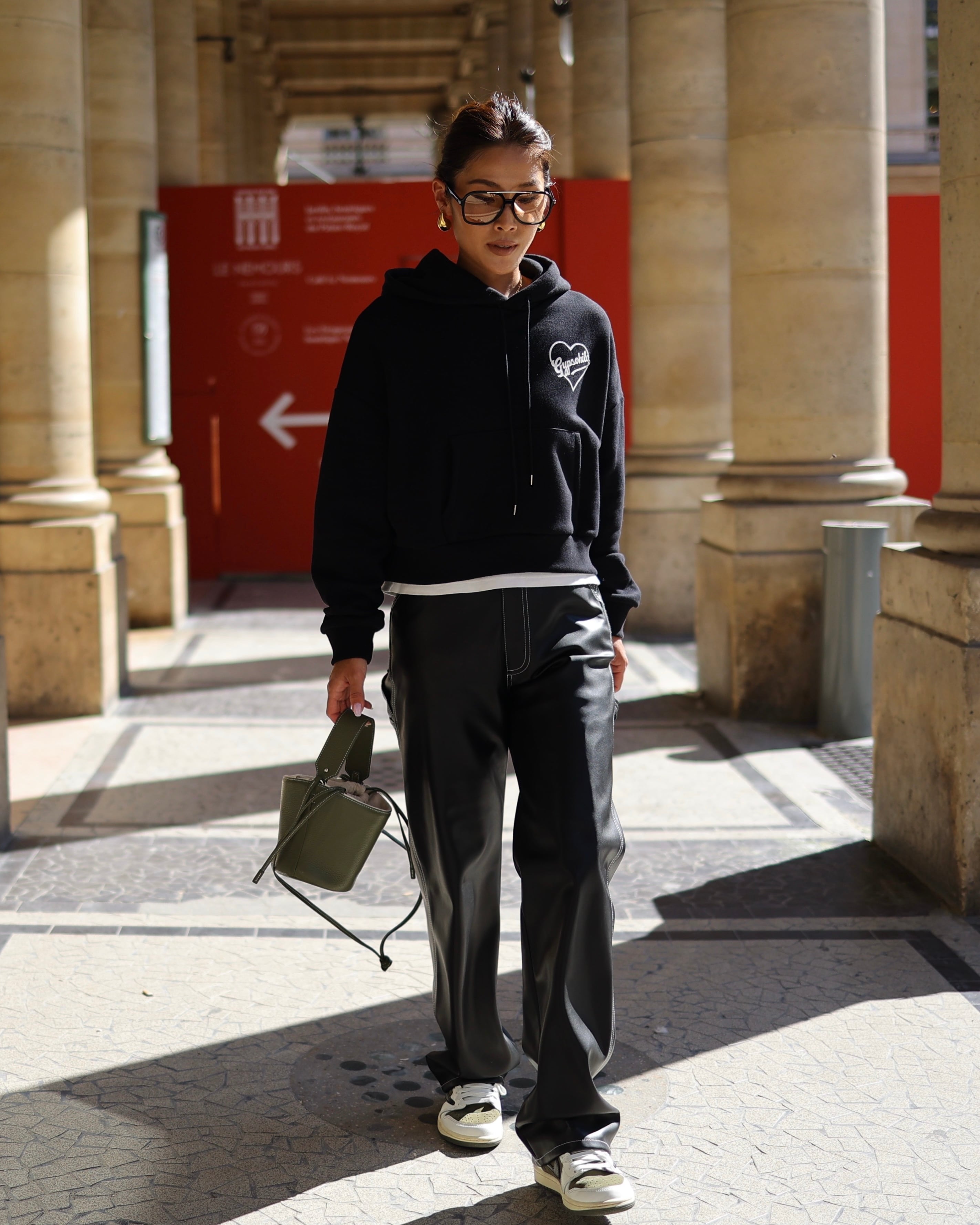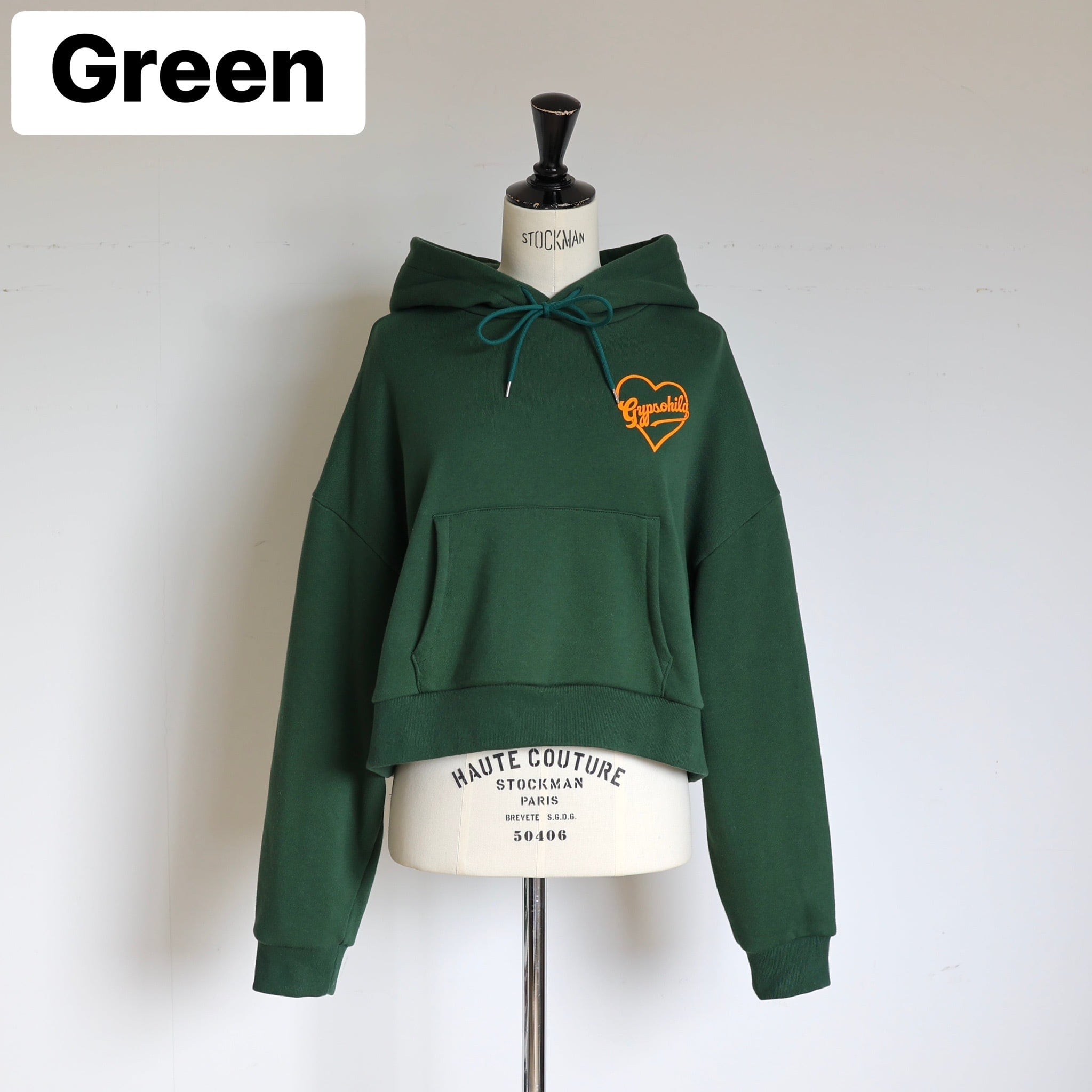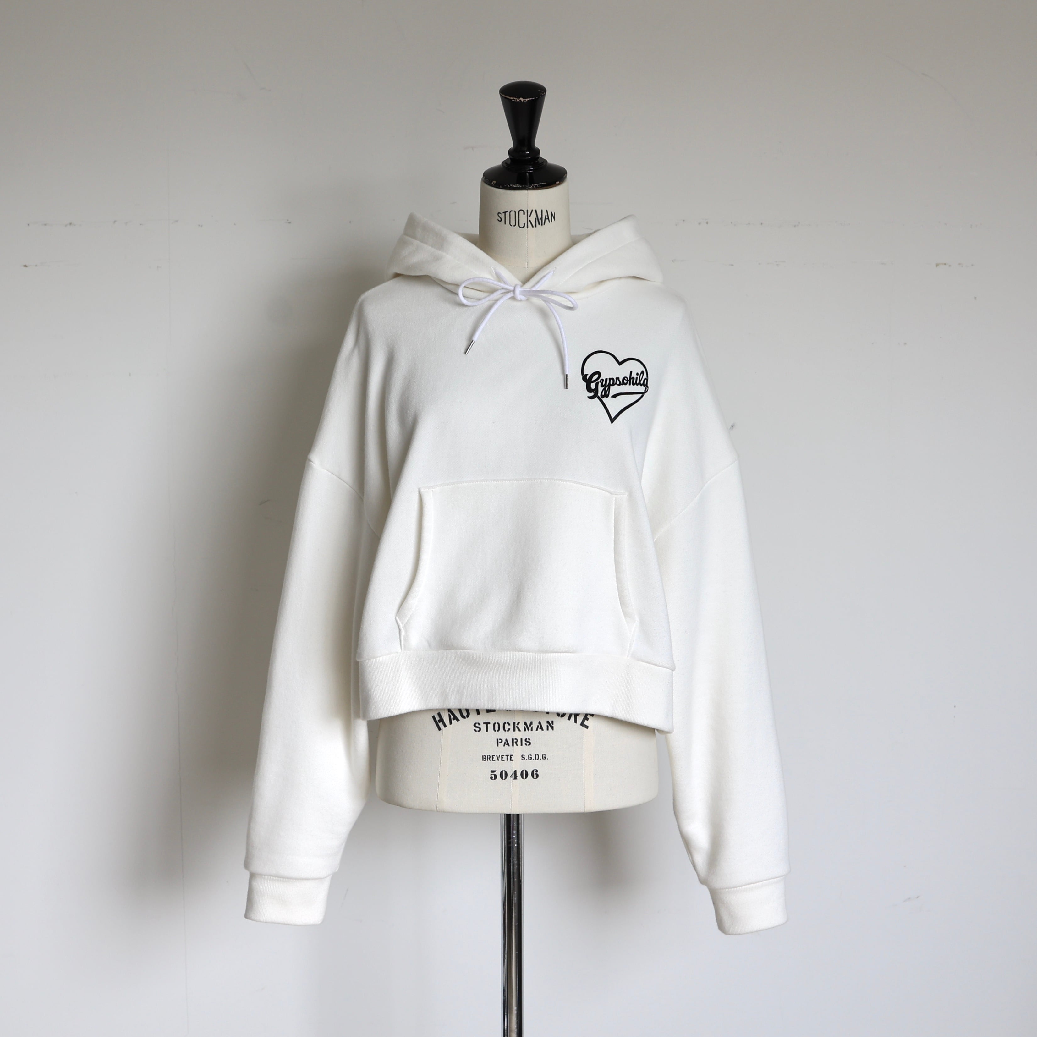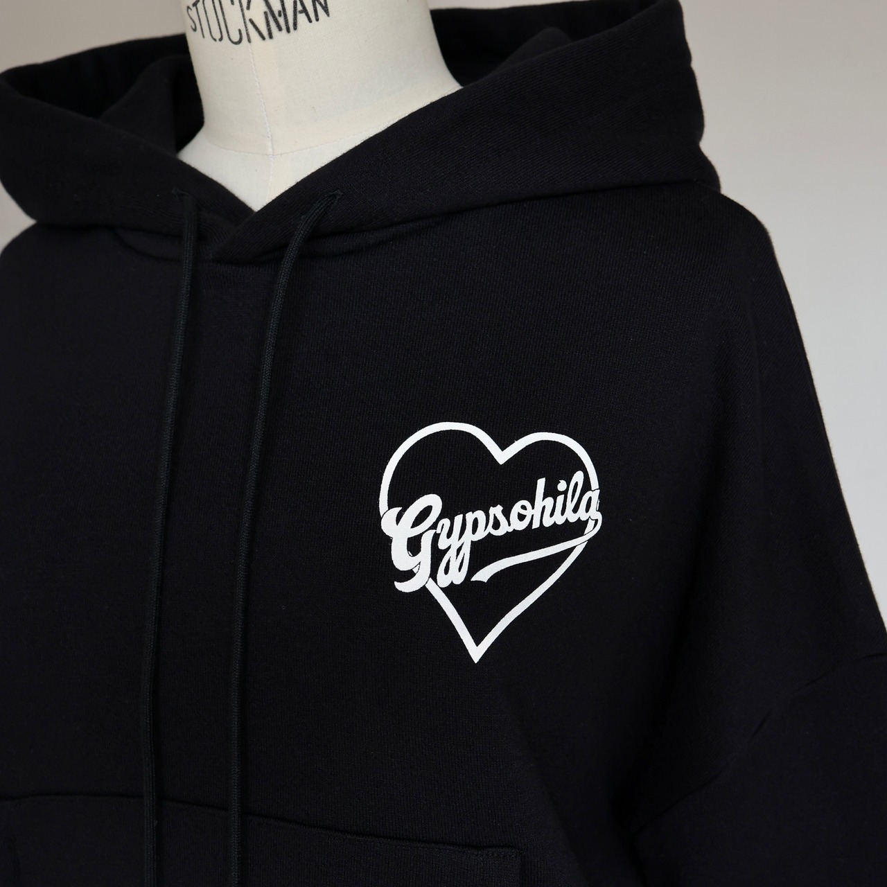 ♡とGypsohilaのロゴが目を惹き、海外の日常を連想させるようなスタイリングを完成させる"ハートフーディー"