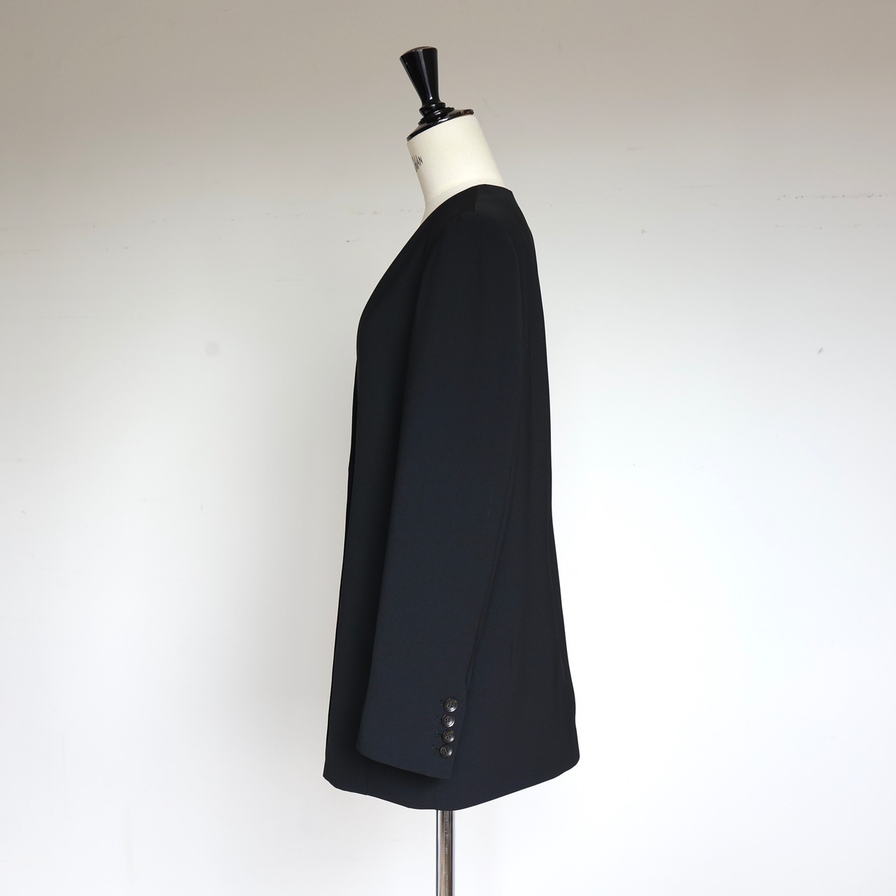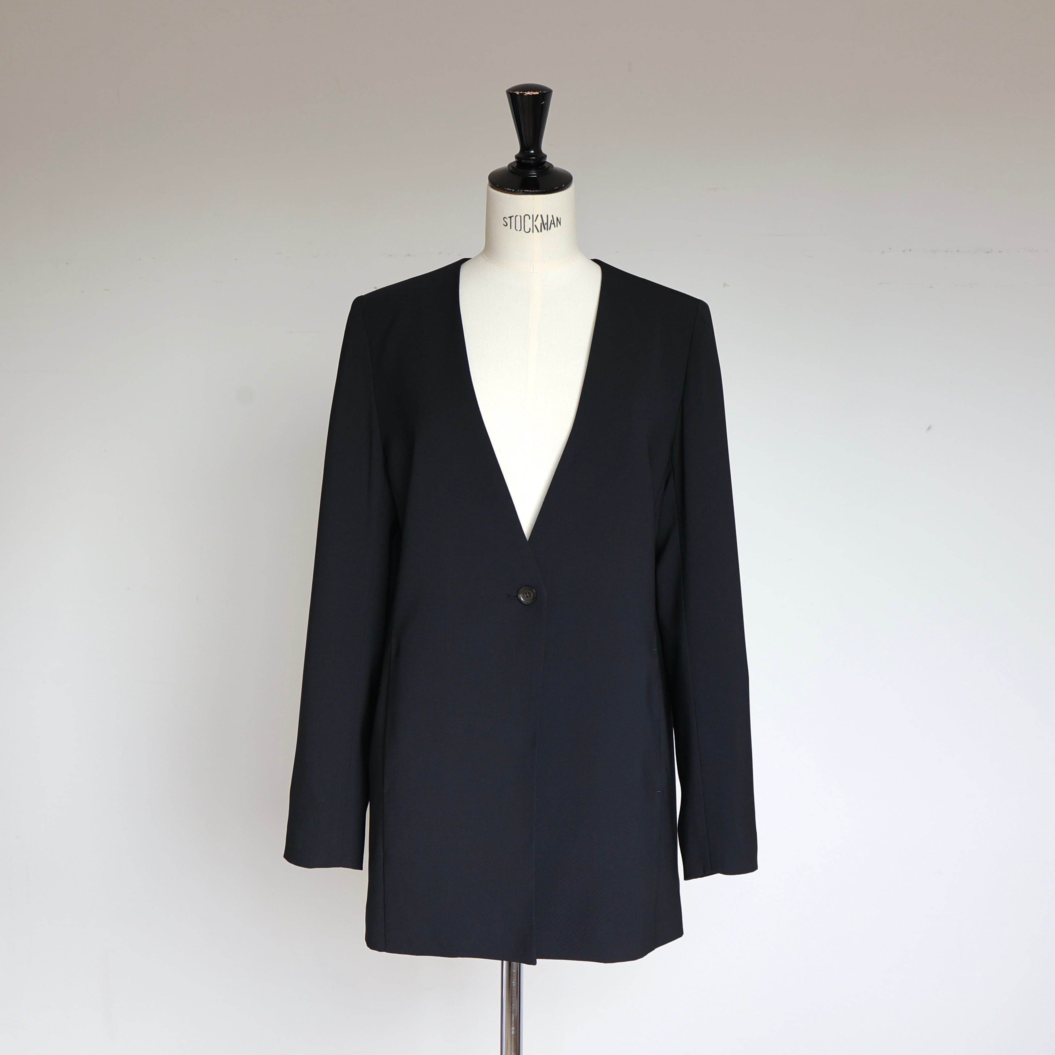 また、深く開いたノーカラーデザインは、インナーを選ばず、ヒップにかかる着丈は、様々なボトムスやワンピースなどとバランスがとりやすいのも魅力的◎