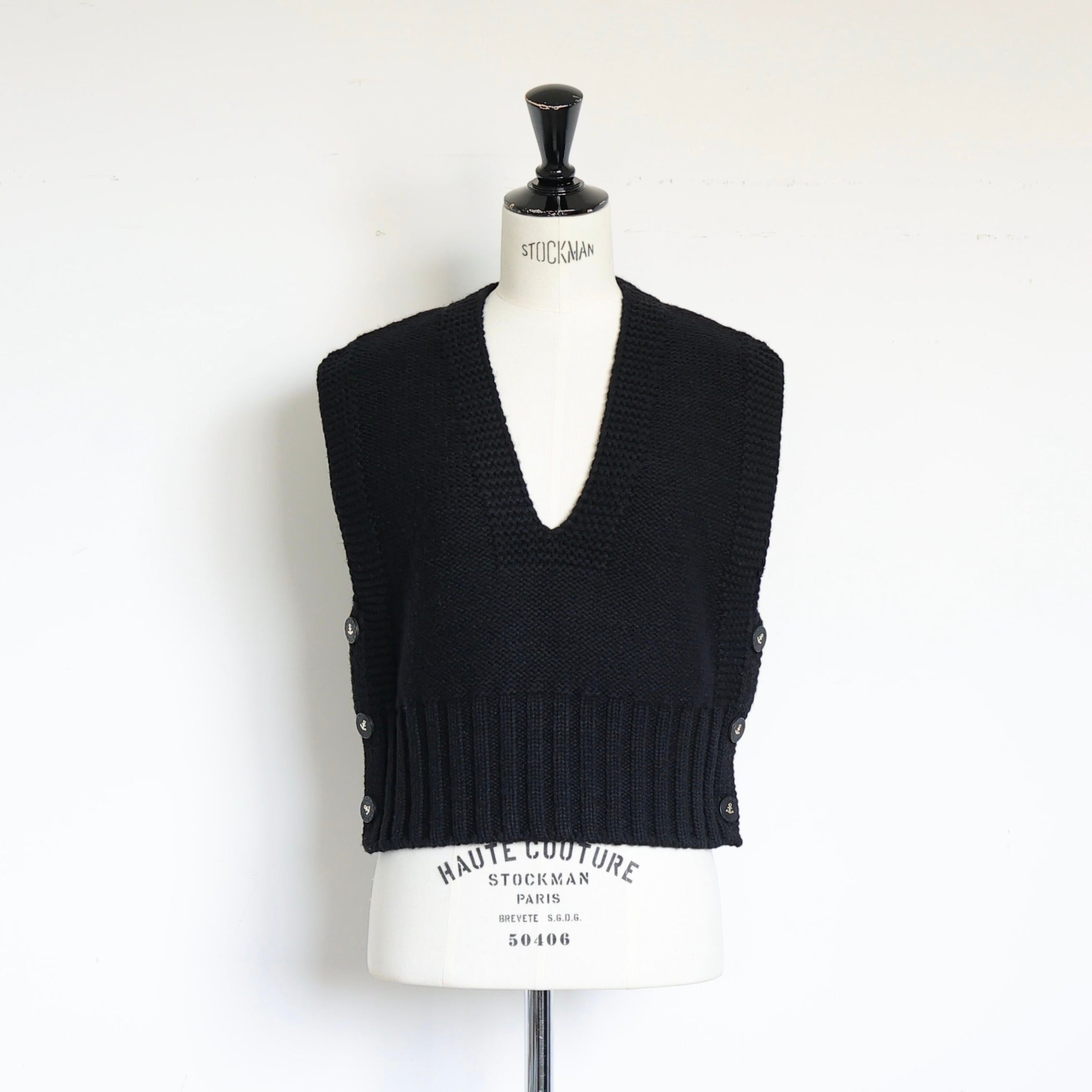 深めのVネックですっきりと顔まわりを見せ、太めのリブが程よい存在感をプラス。 サイドのイカリデザインのボタンがさりげないアクセントになり、開け閉めで着こなしの幅も広がります。