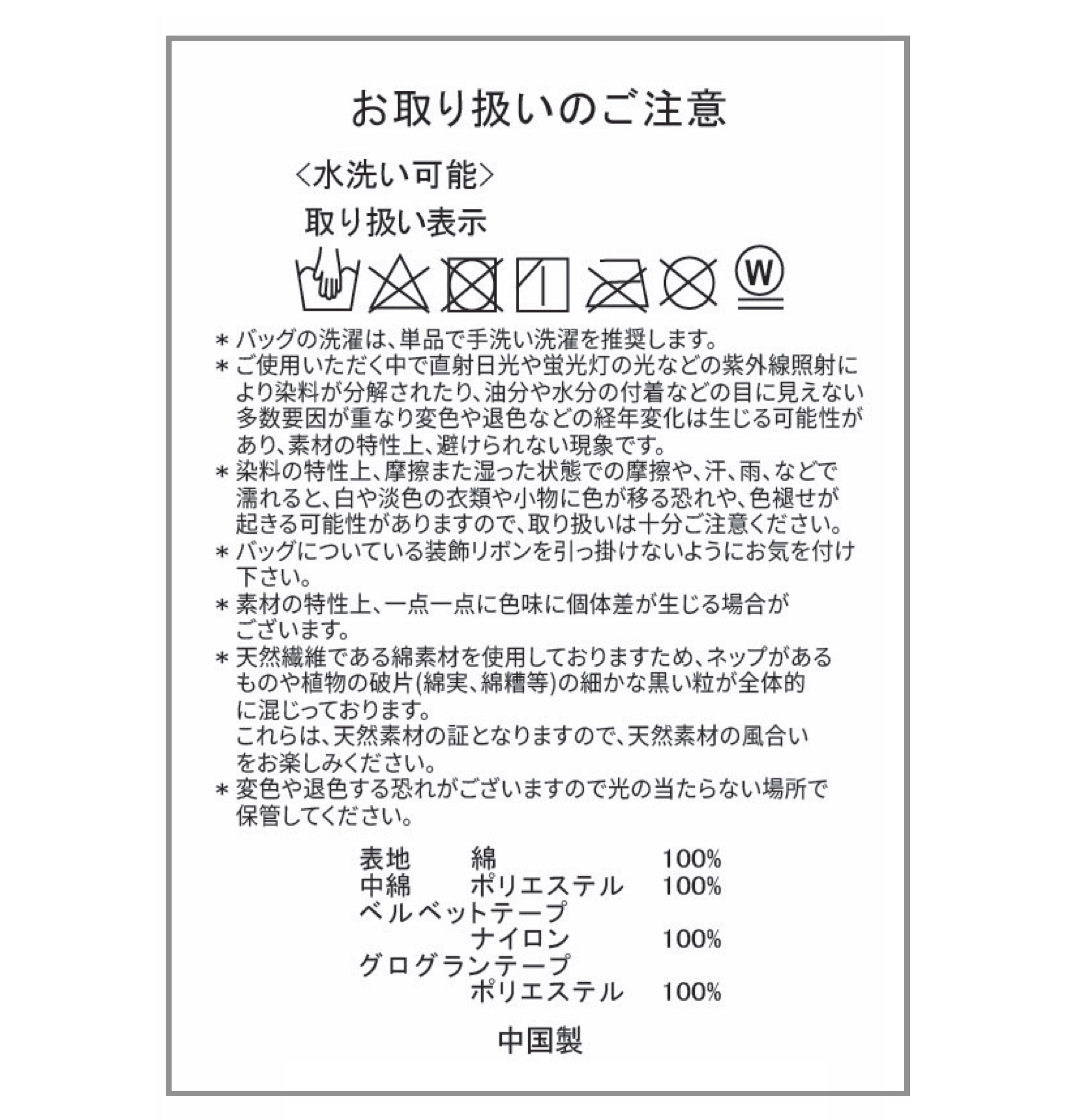 ※1. バッグの洗濯は、単品で手洗い洗濯を推奨します。