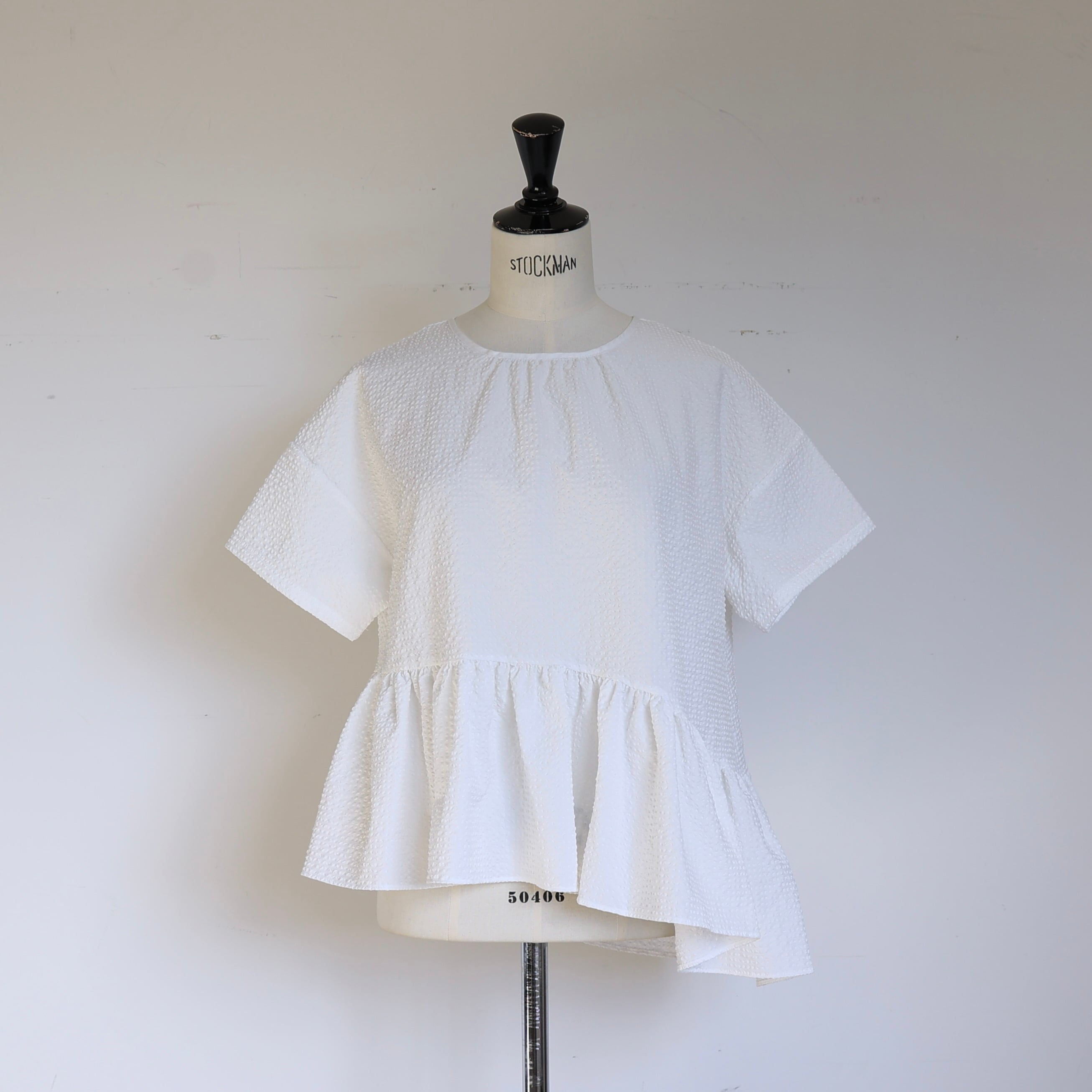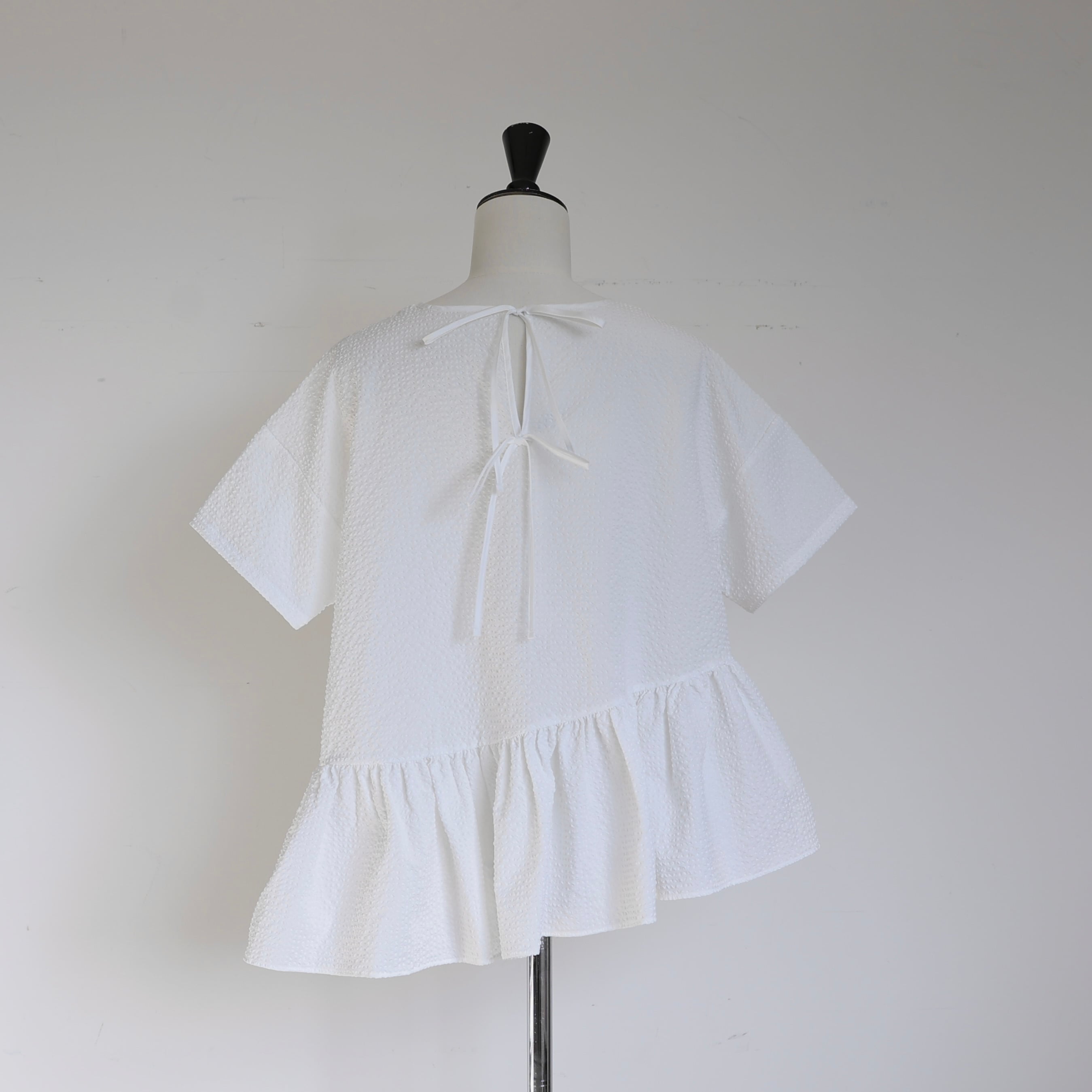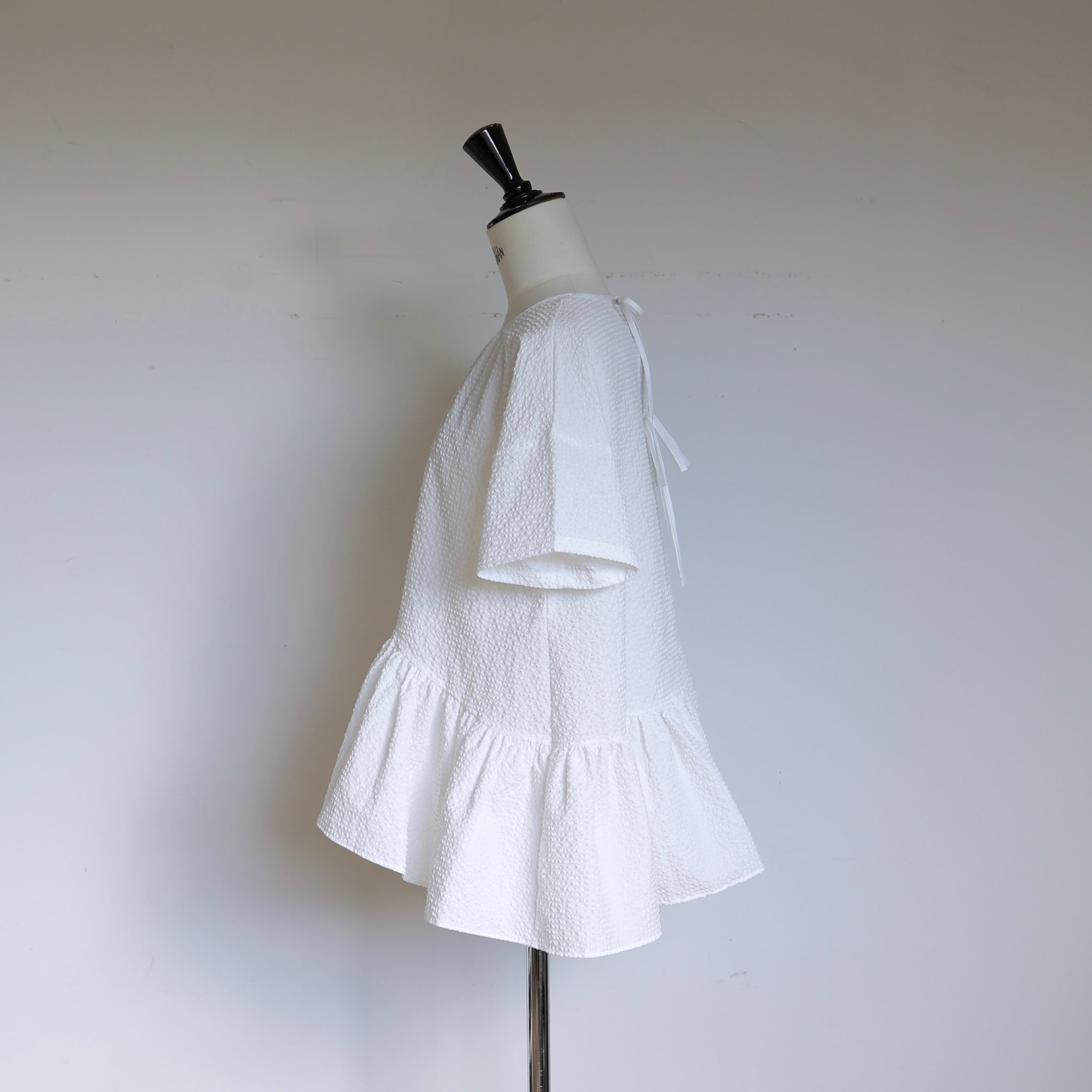 表情のあるぽこぽことした生地が柔らかな立体感を生み、アシンメトリーにデザインされた裾のフリルが軽やかな動きを演出します。