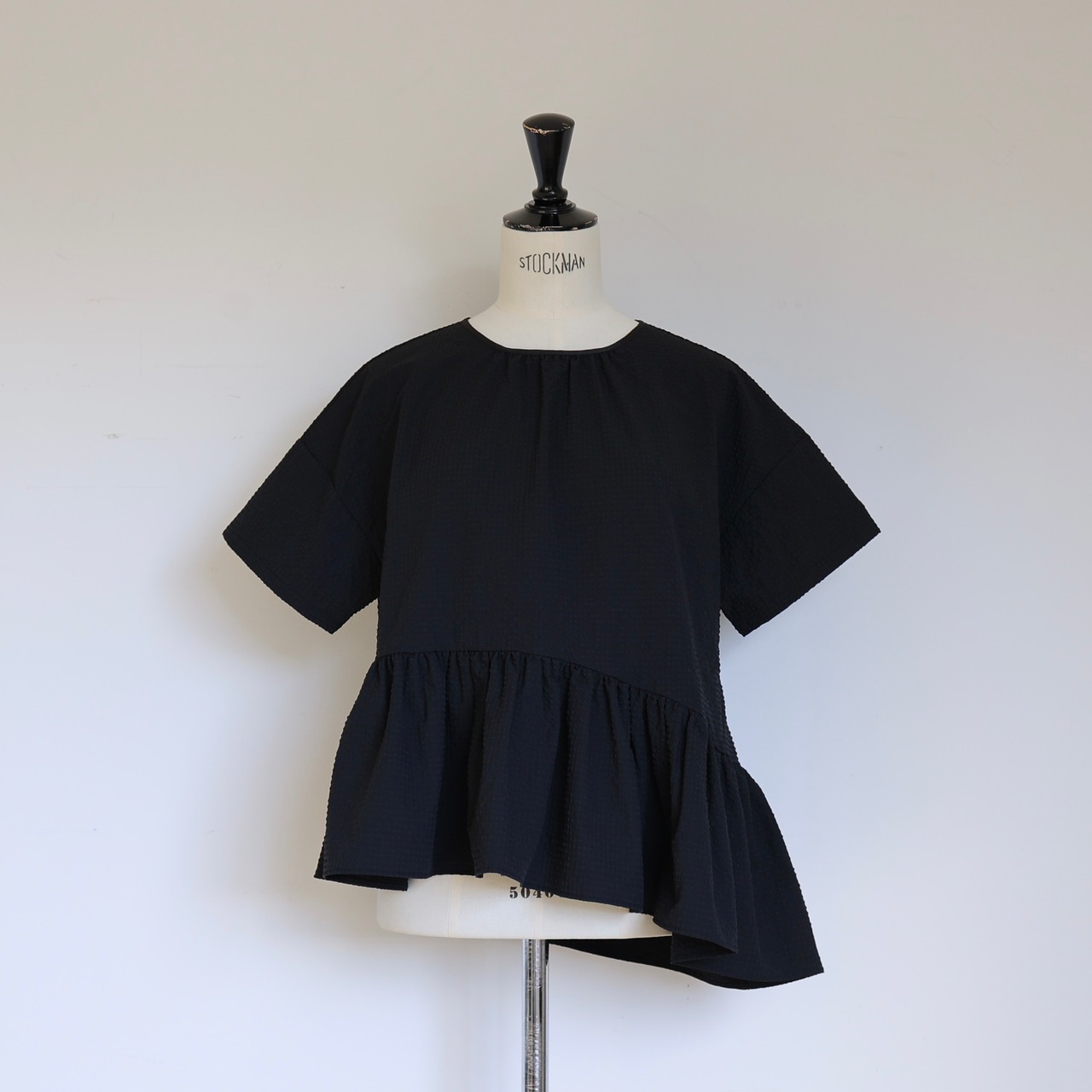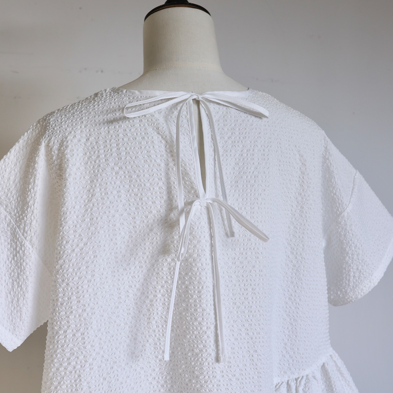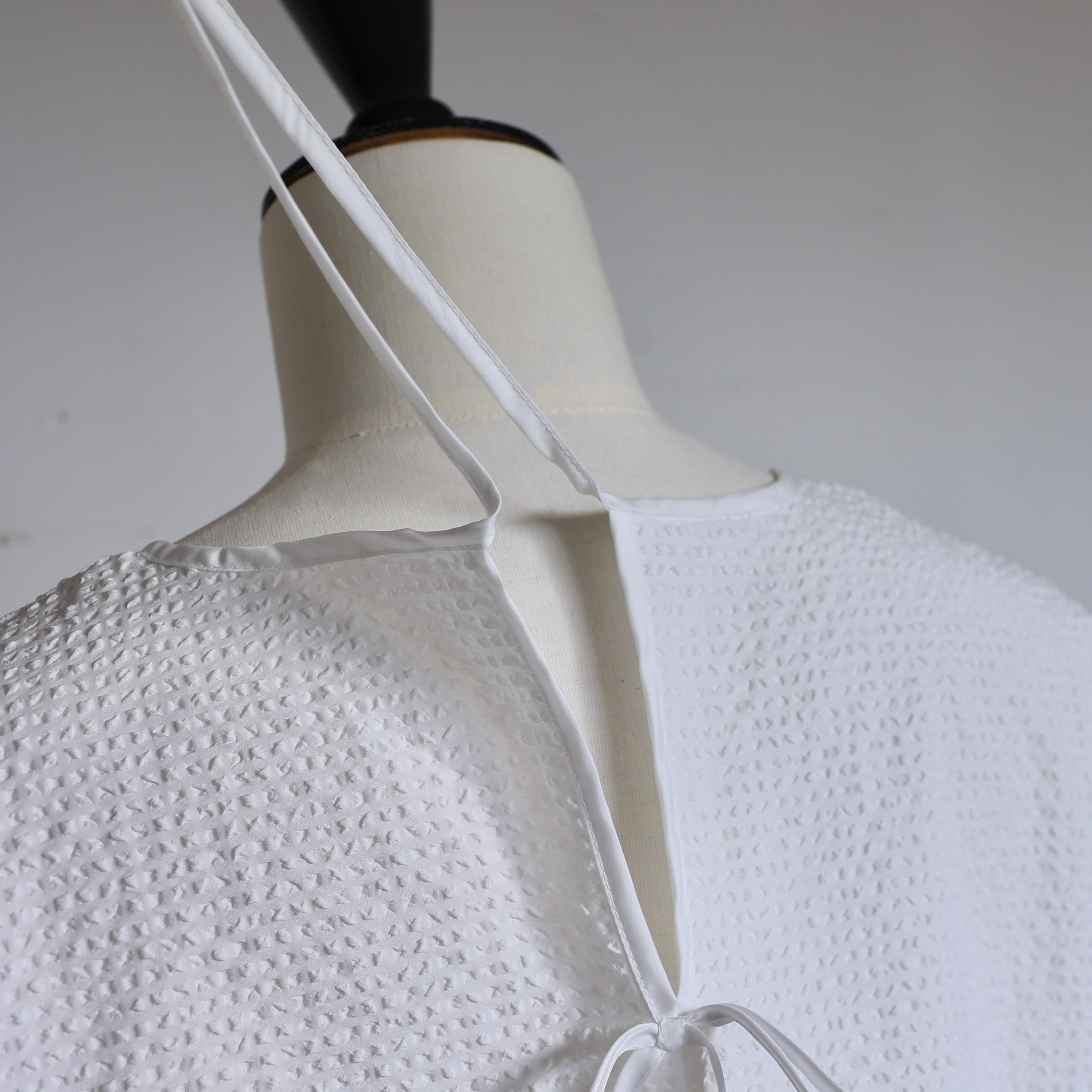 表情のあるぽこぽことした生地が柔らかな立体感を生み、アシンメトリーにデザインされた裾のフリルが軽やかな動きを演出します。