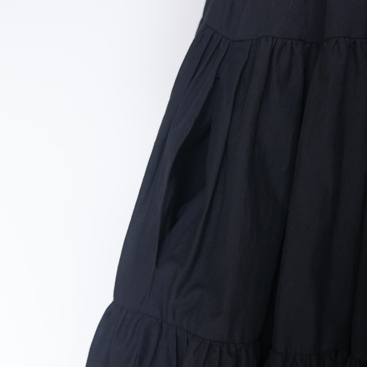 胸元から広がるティアードデザインが、動くたびにふんわり揺れるボリュームシルエットを生み出し、女性らしい柔らかな印象を演出します。