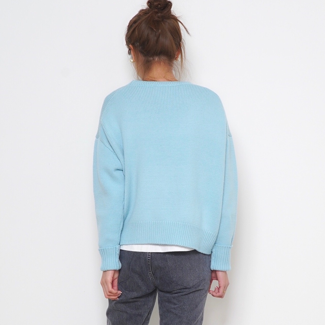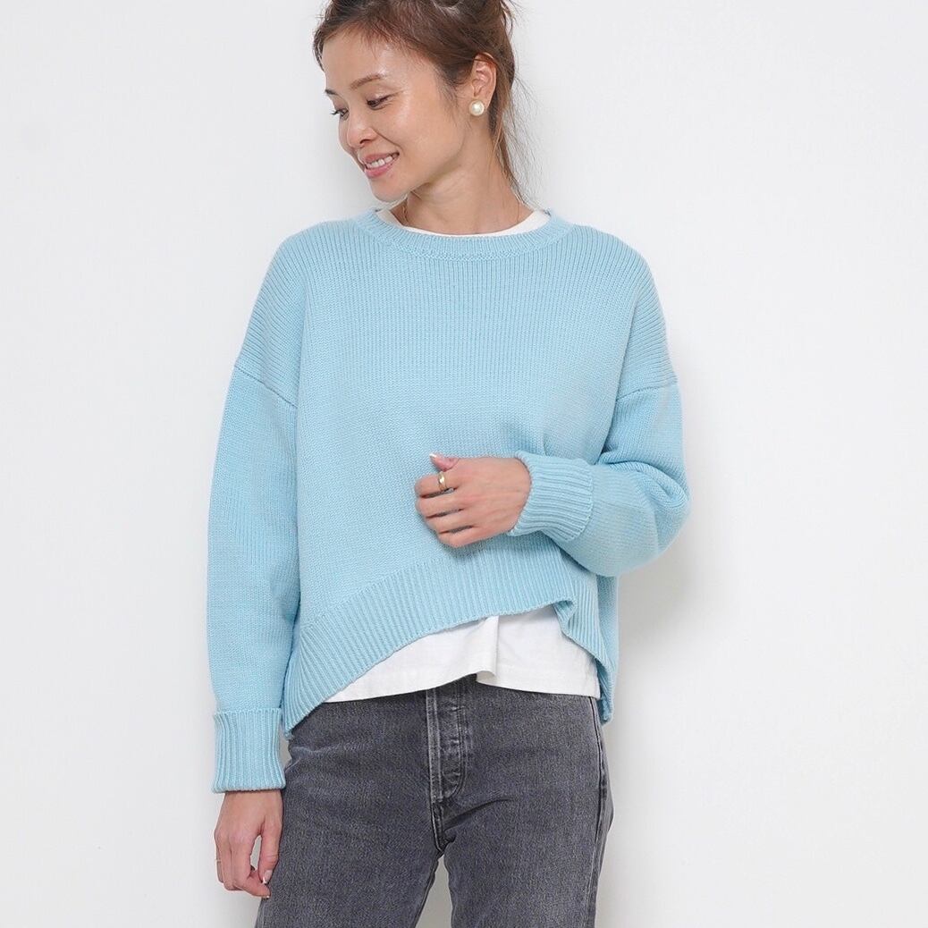 首元はデコルテが程よく見え、抜け感とリラックスした着心地が丁度いい、少し広めのクルーネック。襟リブや編目の流れなど何度も試作を重ねてたどり着いた、ニュアンスのある表情。