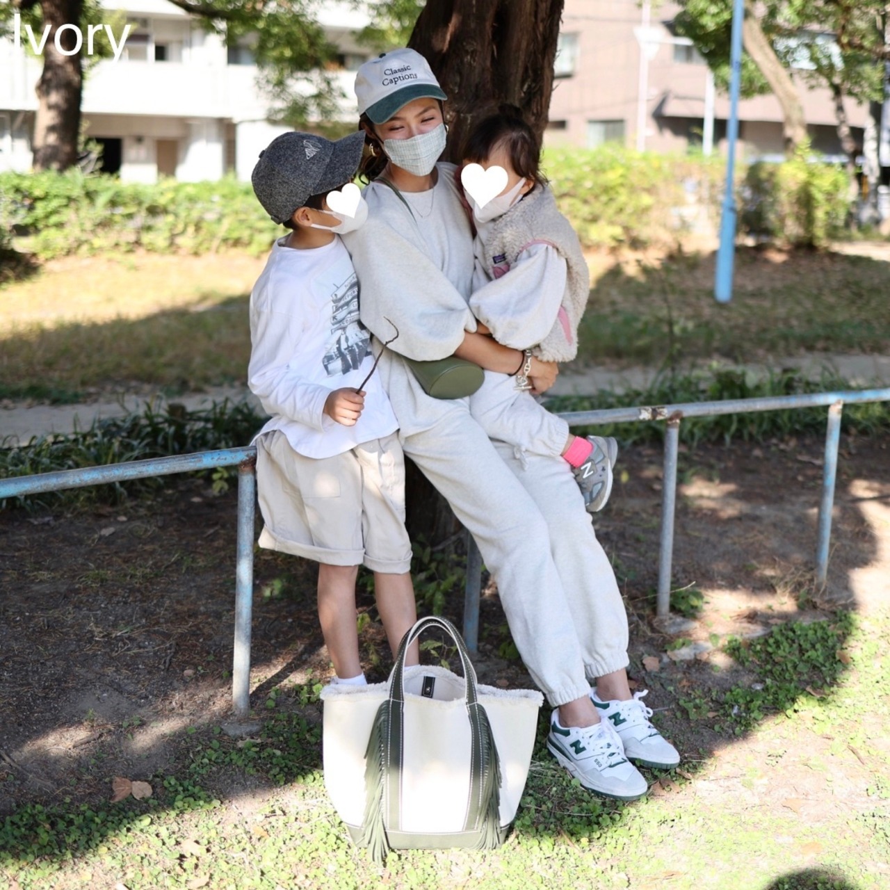 足元はコンバースを、小脇にFringe Bucket BagやDrawstring Bagを持って近所のカフェへ、と様になるセットアップスタイルの完成です。