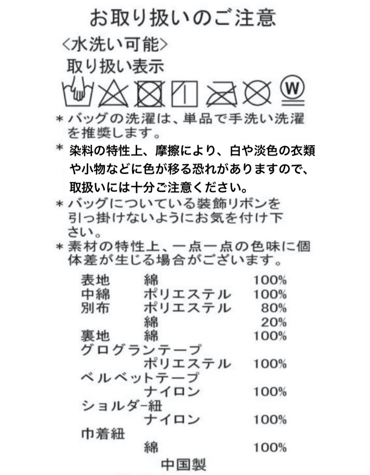 ※1. バッグの洗濯は、単品で手洗い洗濯を推奨します。