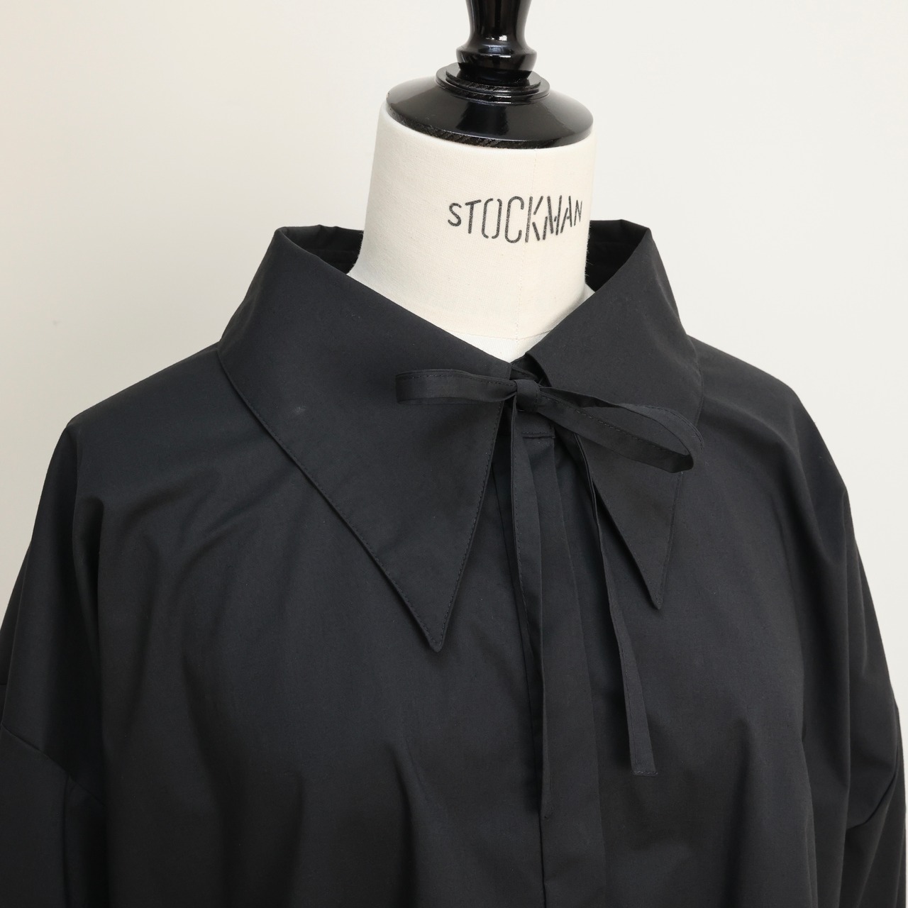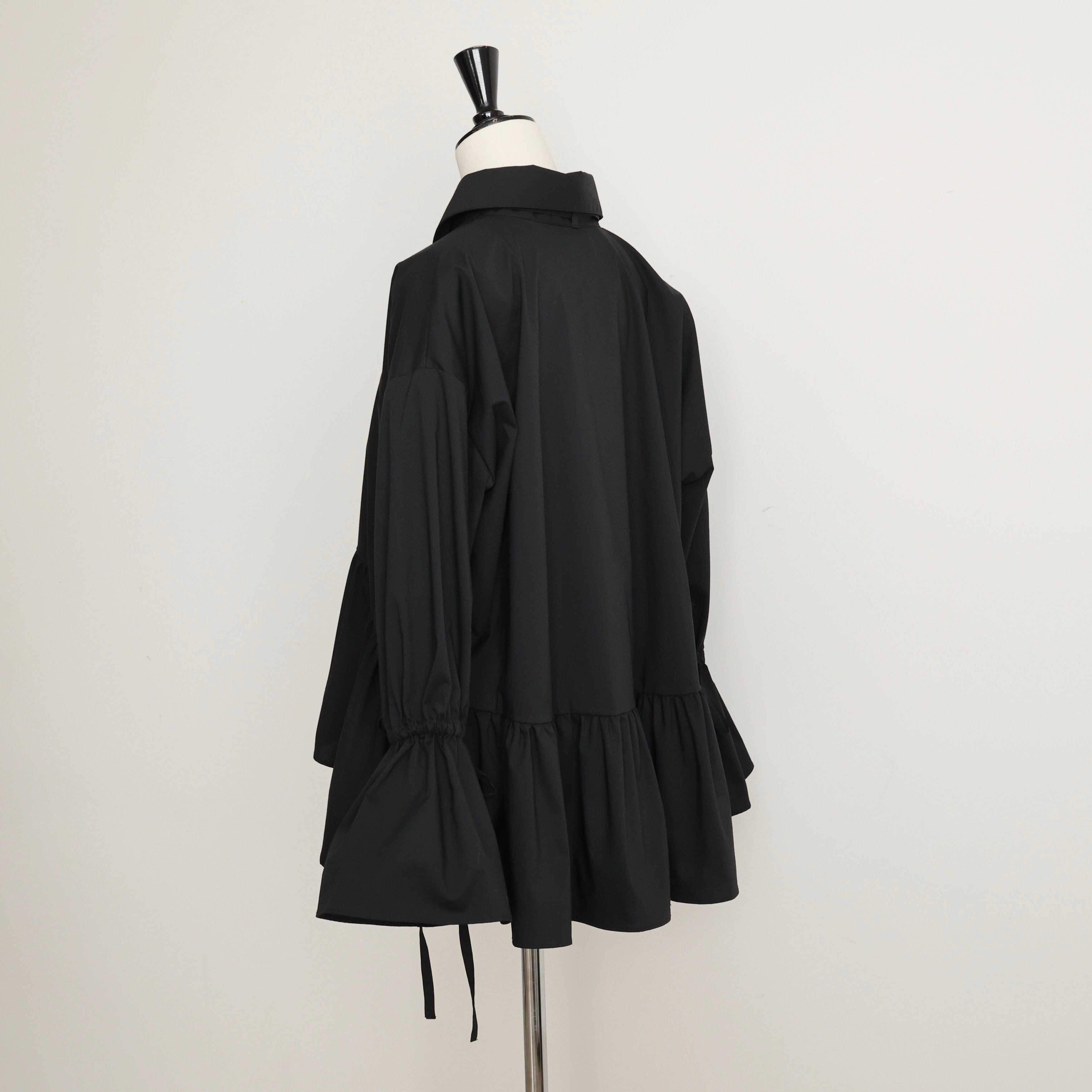 ネック部分にあしらった取り外し可能なリボンにふんわり広がる裾と袖のフェミニンさと、襟にピリッとモードなスパイスを効かせた” ペプラムブラウス"ー。