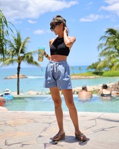 トップスはアメスリが肩周りをスッキリ美しく魅せてくれ、ホルターネックデザインは、バックスタイルも美しくスタイリッシュに。