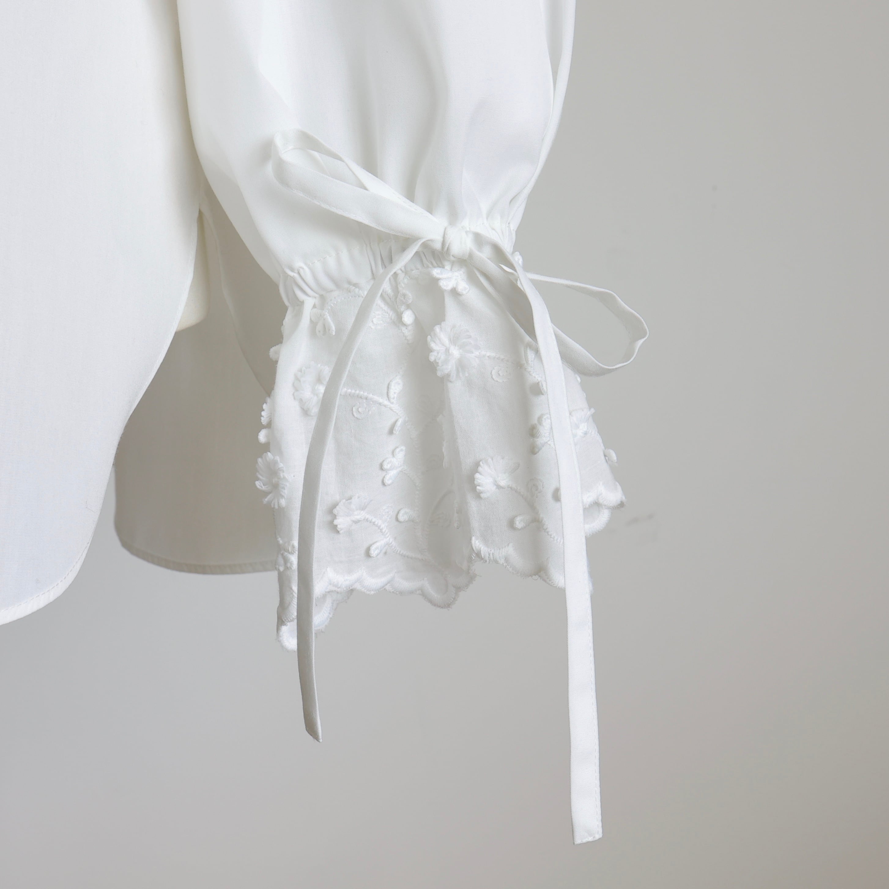 フロント部分と袖口の立体的なお花の刺繍で1着で華やかな印象を演出する”スウィートパターンブラウス”ー。