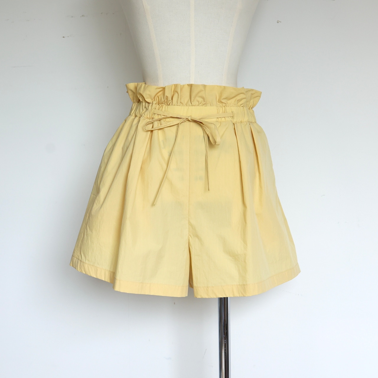 ウエスト部分に配したフリルがウエストをマークしキュッとみせてくれ、ゆとりのある裾の広がりが相まって脚長効果も◎