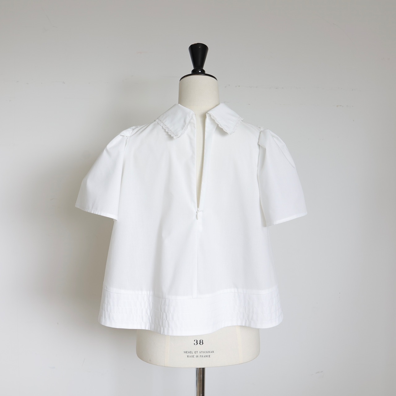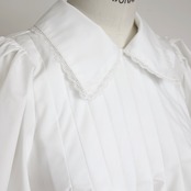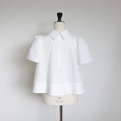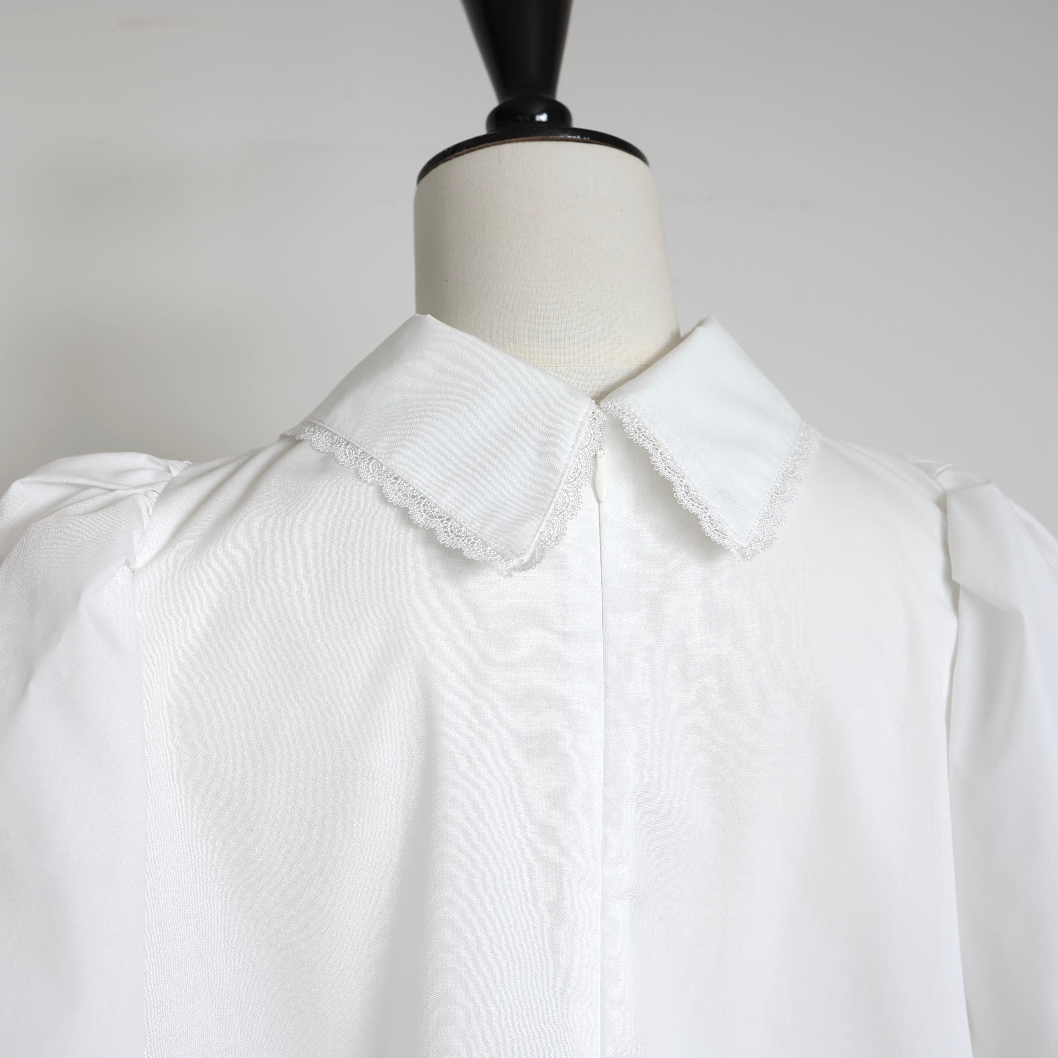 レースの衿、構築的なスリーブ、フロントのタック、ふんわり広がる裾とディテールが光る一枚で華奢見え効果もあり。